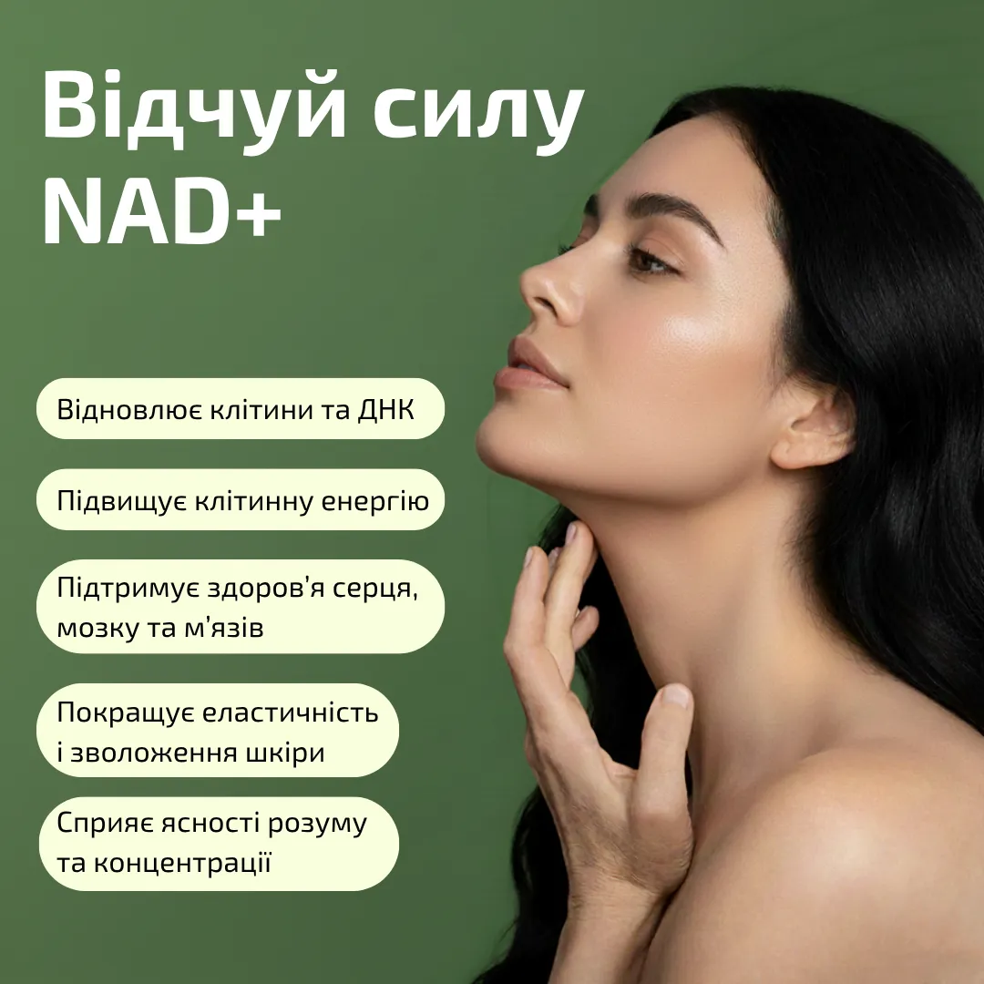 Почала приймати NAD+ (NMN-форму), і за місяць відчула різницю: більше сил на йогу та роботу, шкіра стала пружнішою, без 'втомленого' вигляду. Без побічних ефектів, просто стабільна енергія без кофеїну. Рекомендую для тих, хто хоче уповільнити час!